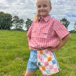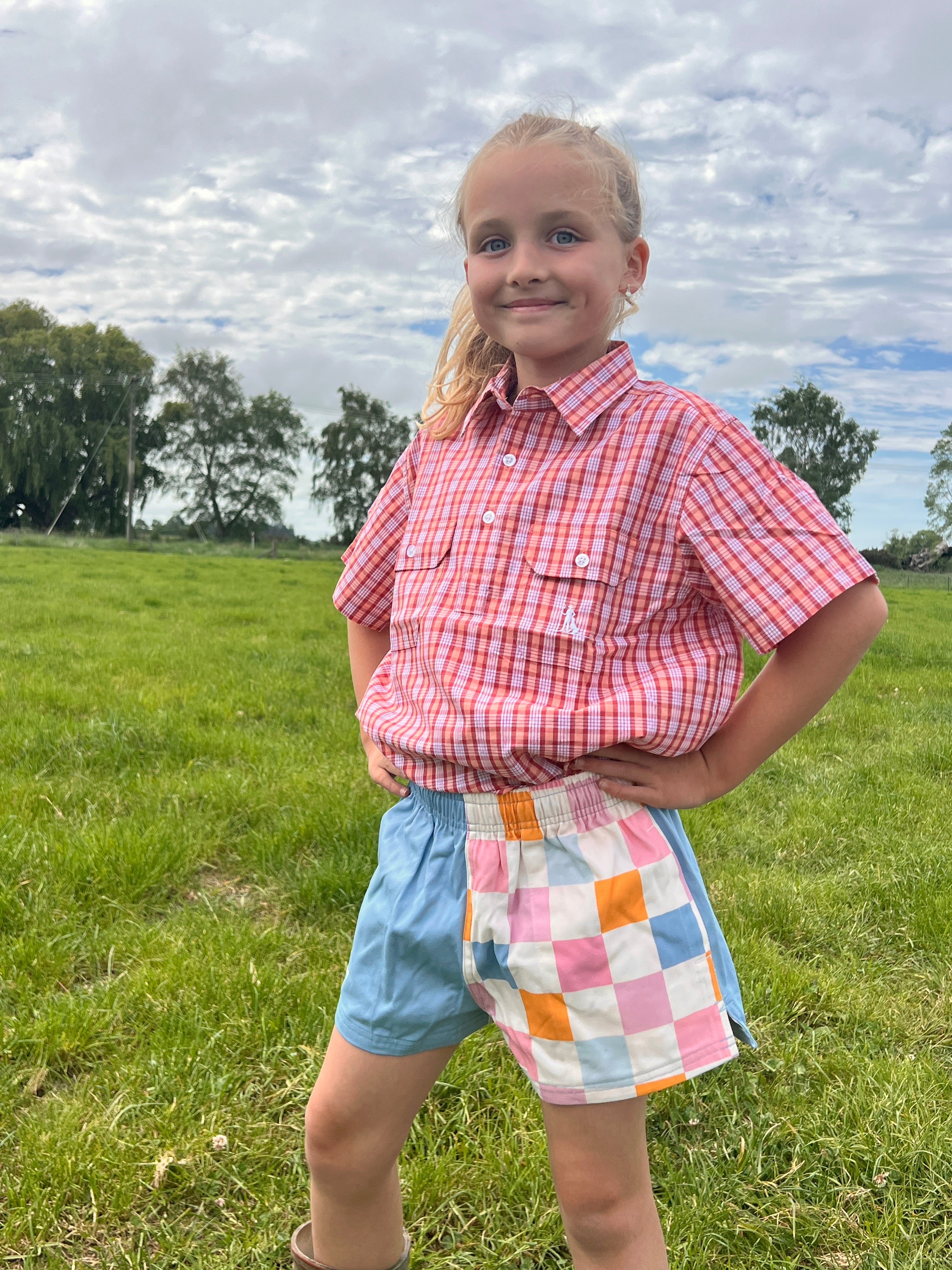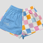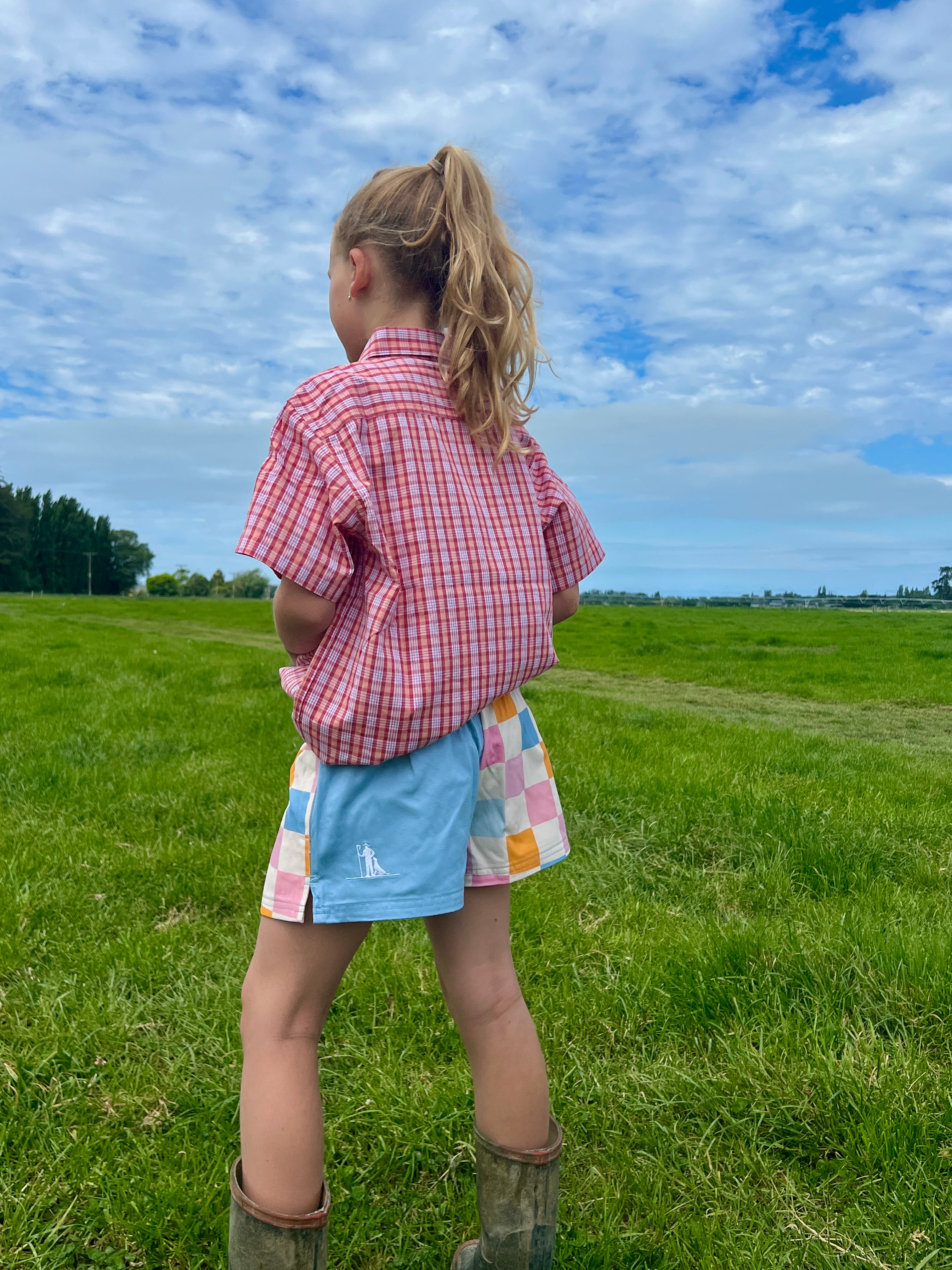 A dreamy pastel checker pattern exclusive print to our brand that you won't see elsewhere with soft sky-blue panels, these shorts are bursting with colour and ready for your summer adventures. Specially crafted 100% cotton fabric designed exclusively for us.