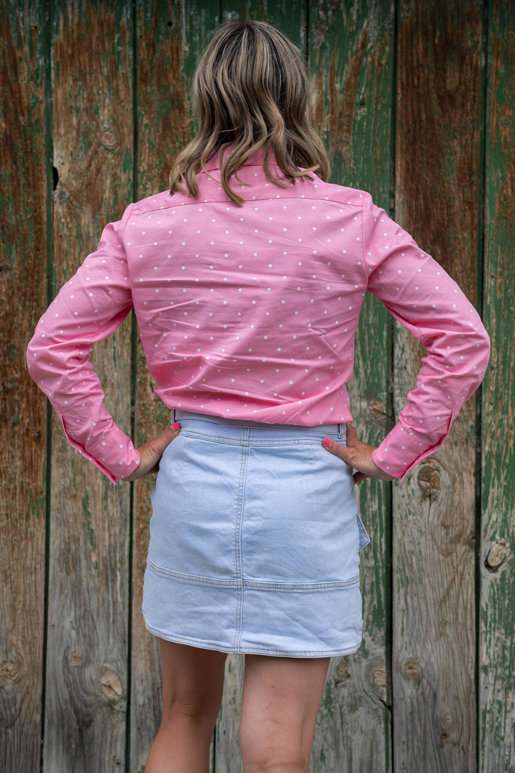 This light pink polka dot beauty brings all the fun, with a statement ruffle running down the left side of the full button opening.